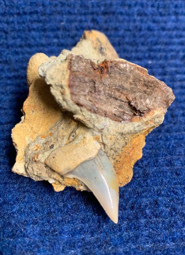Naturally occurring piece of STH bonebed 1 1/2" X 1 1/2" containing: One upper Hooked Tooth Mako shark tooth (isurus planus) 1 1/2" x 1 " cream colored with peach tones. Temblor Formation Round Mountain Silt Member in the Sharktooth Hill area of Bakersfield, CA 15.5 MYO