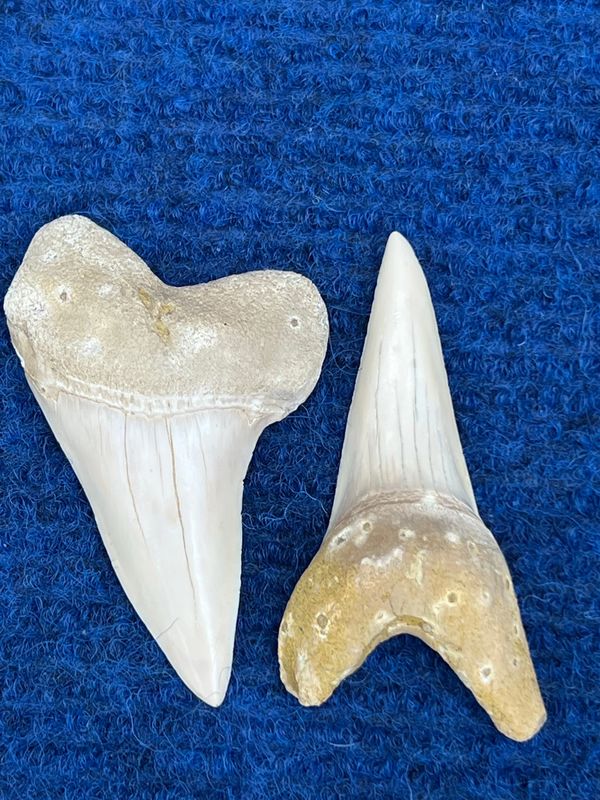 Large Hook Toothed Mako upper 2 3/16" X 1 6/16"and Big Toothed Mako lower 2 2/16" X 1 2/16"(Isurus hastalis) beautiful white/cream color with shiny enamel Temblor Formation Round Mountain Silt Member of the Sharktooth Hill area of Bakersfield, CA